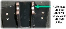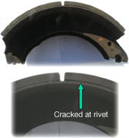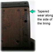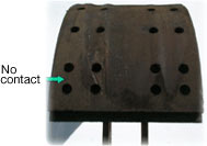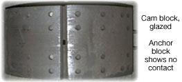 When brake drums are removed, the brake lining should be inspected for signs of unusual or atypical wear. Common problems may arise as a result of ignoring hardware upkeep and s-cam bushings. These problems include but are not limited to: Bottom brake shoe worn more than the top shoe; Lead shoe blocks primary contact, with very little contact on the anchor block; Excessively noisy brakes.